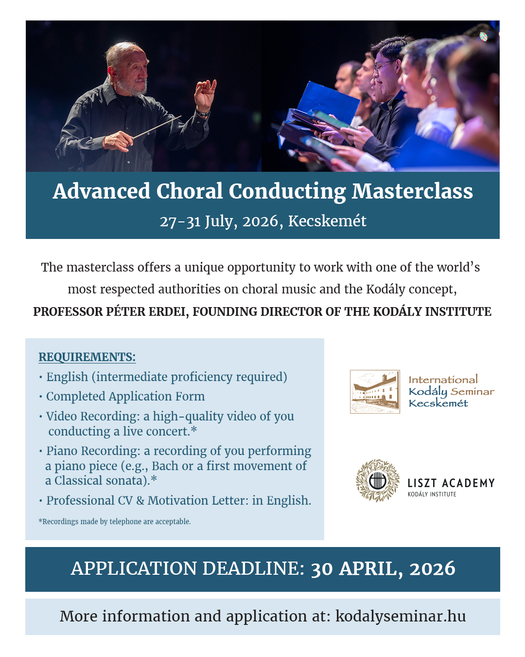 Alapítvánnyal, a 35. Nemzetközi Kodály Szeminárium keretében karvezetés mesterkurzust hirdet fiatal, pályájuk elején lévő kóruskarnagyok számára, repertoárjuk és szakmai tapasztalataik bővítésére.