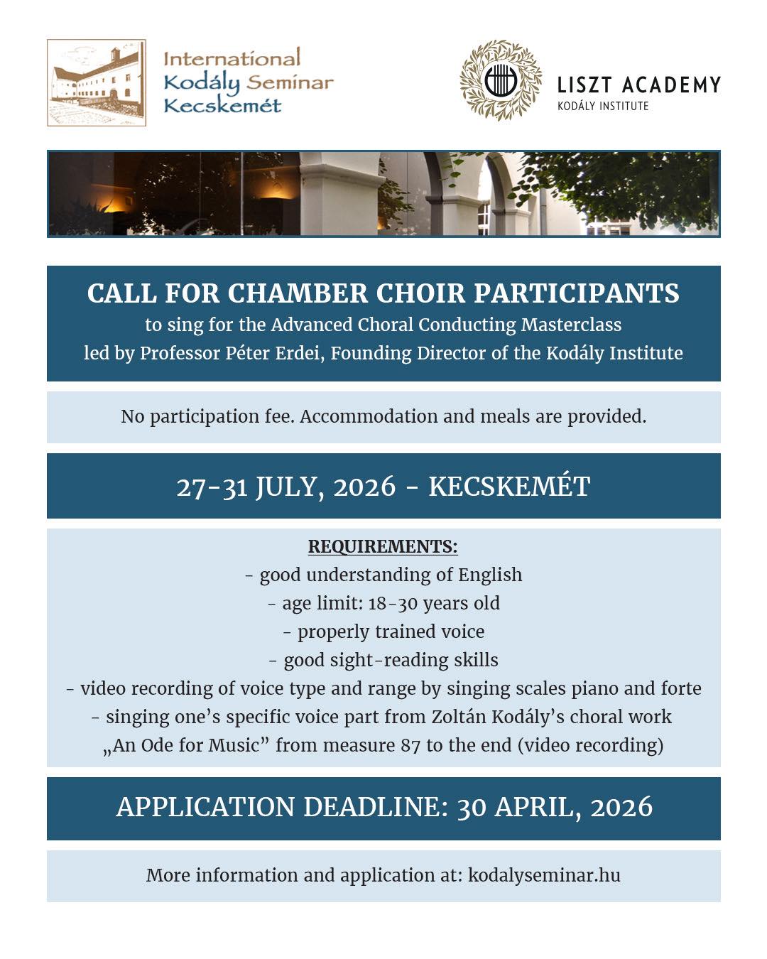 Szintén lehet jelentkezni a Kodály Szeminárium Kamarakórusában való részvételre is, ide fiatal énekeseket, zeneakadémistákat, egyetemi hallgatókat várnak. Ez az alkalmi 20 fős
